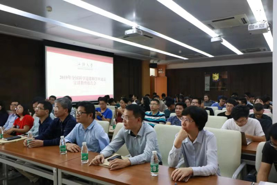 为学习贯彻习近平新时代中国特色社会主义思想和习近平总书记关于科学道德和学风建设的重要指示精神,落实《关于进一步弘扬科学家精神加强作风和学风建设的意见》,深入推进科学道德和学风建设宣讲教育工作,全国科学道德和学风建设宣讲教育领导小组于11月13日在北京人民大会堂举办2019年全国科学道德和学风建设宣讲教育报告会。我校高度重视,13日下午组织研究生导师代表、研究生代表、科研处与研究生院等100多名师生收看了同步直播,同时,通知各单位师生自行收看报告会直播。