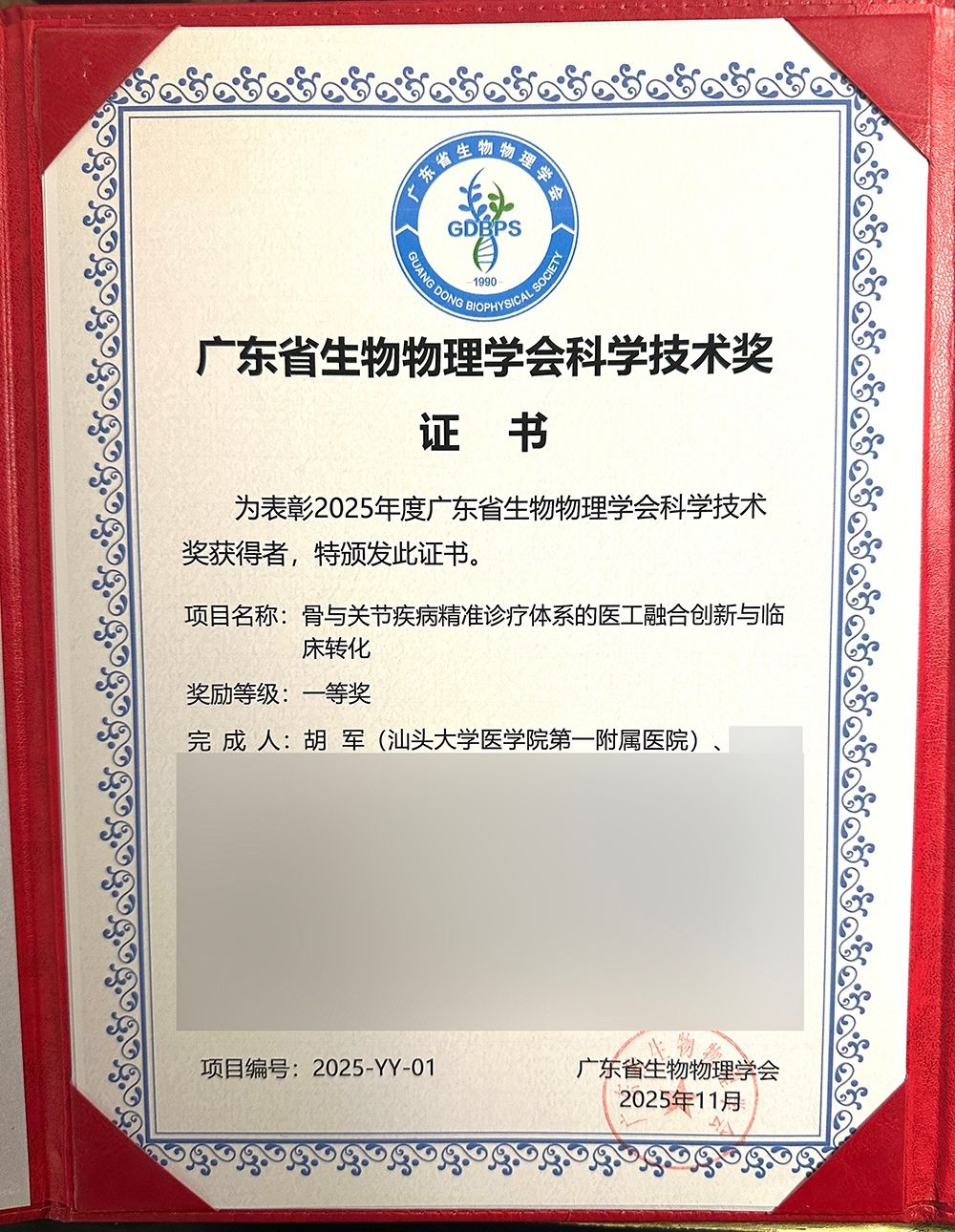 经会前严格评审,胡军教授领衔的项目《骨与关节疾病精准诊疗体系的医工融合创新与临床转化》荣获“2025年度广东省生物物理学会科学技术奖一等奖”,并在大会期间举行了颁奖仪式。该奖项是对团队在医工融合、临床转化与技术创新方面突出成就的权威认可,彰显了团队在该领域的引领地位。