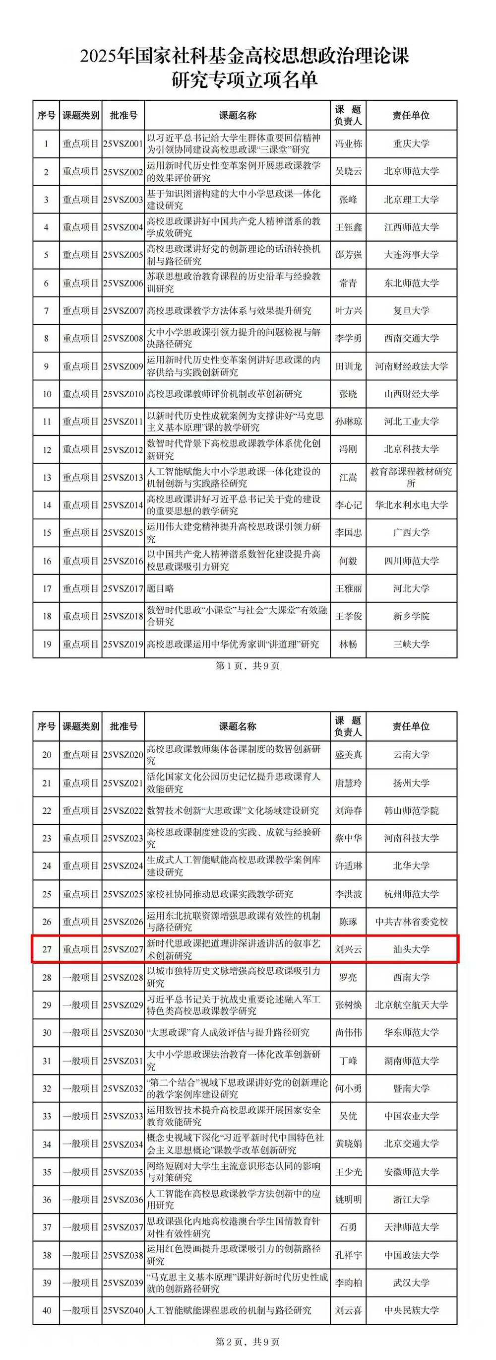 近日,全国哲学社会科学工作办公室正式公布2025年国家社科基金高校思想政治理论课研究专项立项名单,汕头大学马克思主义学院刘兴云教授申报的课题《新时代思政课把道理讲深讲透讲活的叙事艺术创新研究》(批准号:25VSZ027)成功获批重点项目资助。课题组成员包括江苏省社科院胡勇博士、汕头大学马克思主义学院石小娇博士及硕士研究生谭媛等。